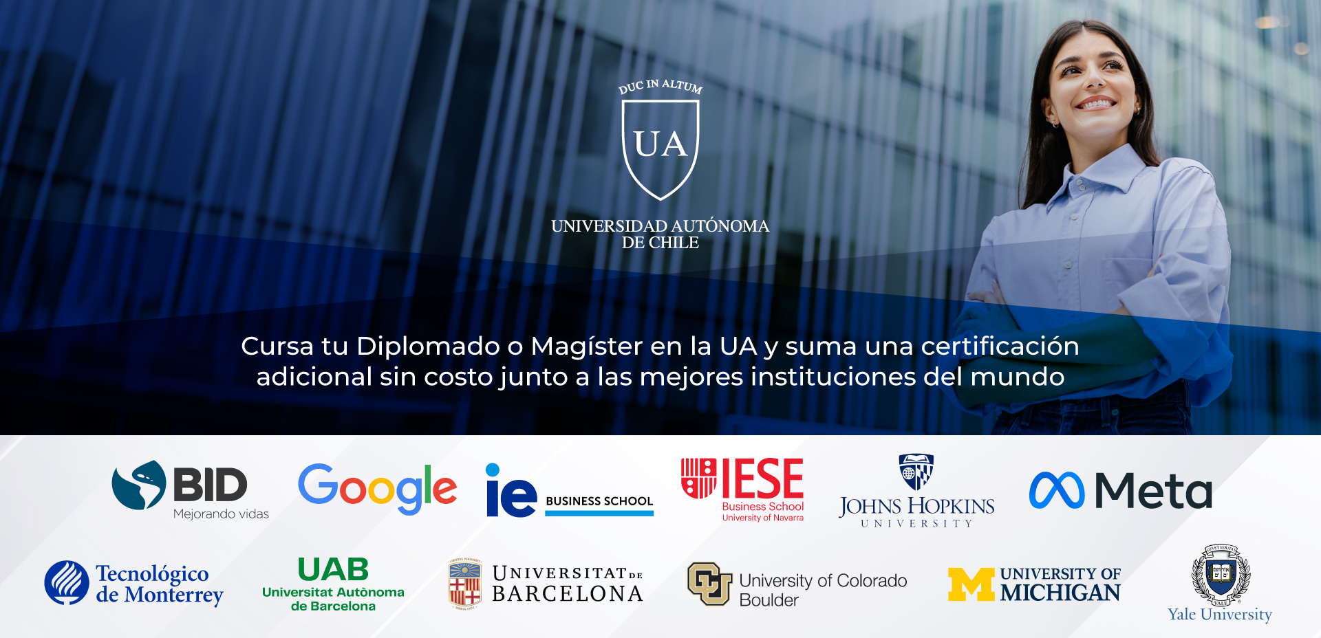 Los programas de postgrado de la Universidad Autónoma de Chile te permiten acceder a certificaciones internacionales junto a instituciones de excelencia como Google, Meta, Yale University, Johns Hopkins University, University of Michigan, Tec de Monterrey, IE Business School, entre otras.