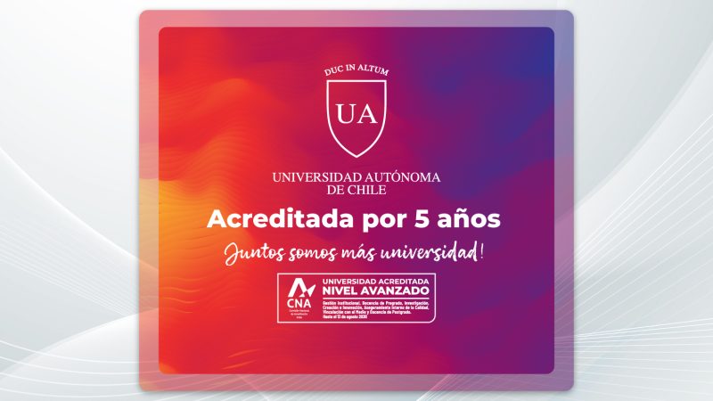 La Universidad Autónoma de Chile ha sido acreditada por la Comisión Nacional de Acreditación (CNA) en Nivel Avanzado por un período de 5 años, vigente desde el 13 de agosto de 2025 hasta el 13 de agosto de 2030. Este importante reconocimiento consolida el compromiso institucional con la excelencia académica, la gestión de calidad y el desarrollo profesional de sus estudiantes.
